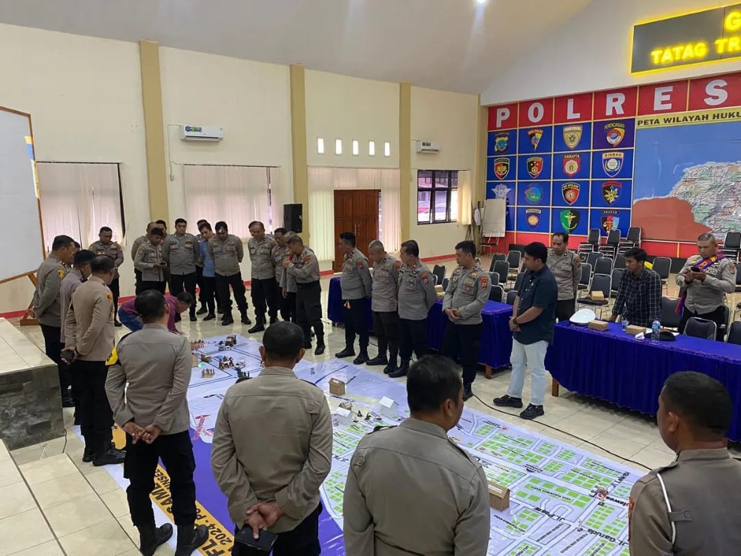 Latpra OMP 2024 hari terakhir diisi dengan simulasi Tactical Floor Game (TFG) sebagai bagian dari manajemen strategi mengantisipasi potensi situasi kontijensi pada pelaksanaan pengamanan Pilkada 2024 di wilayah hukum Polres Minsel. (*tim-Chris)