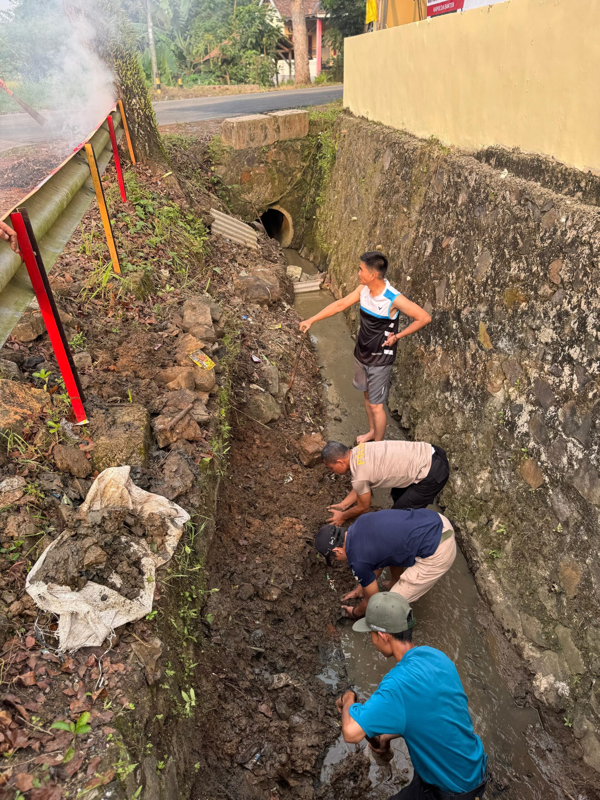 Tak Segan Kotor, Jajaran Polsek Cibadak lakukan Giat Bersih-Bersih Selokan di depan Mapolsek.