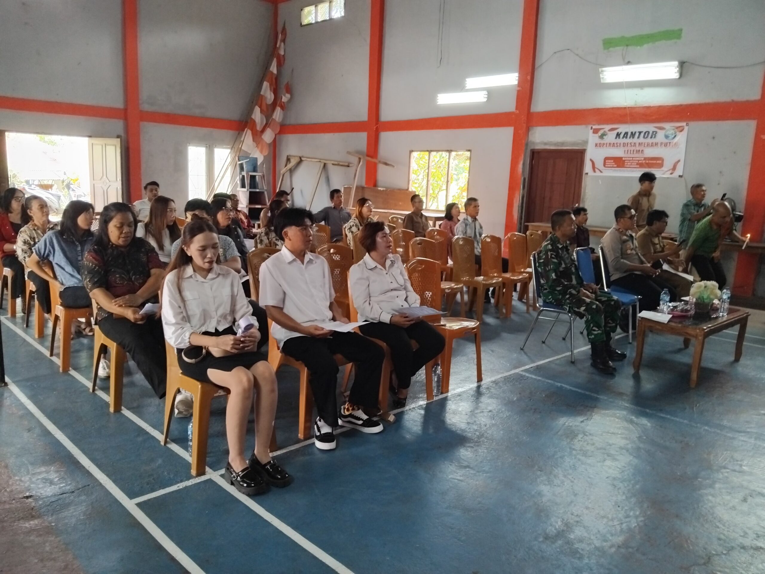 Pelaksanaan ibadah dilaksanakan di dalam ruang Aula pertemuan kantor desa, ibadah dipimpin oleh Nyonya Pendeta Agustina Nelly Sumampow-Pasla