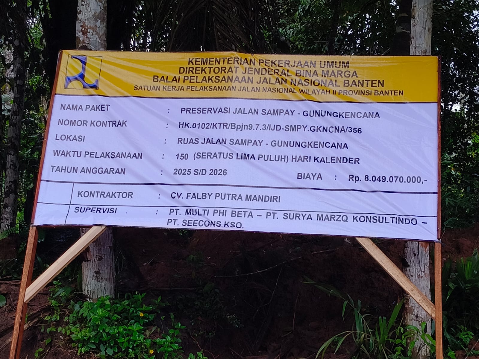 Dalam papan informasi proyek yang terpasang di lokasi, tercantum kegiatan dengan nilai anggaran Rp 8.049.070.000, waktu pelaksanaan 150 hari kalender tahun anggaran 2025–2026, serta pelaksana kegiatan oleh CV. Falby Putra Mandiri dengan konsultan supervisi gabungan.