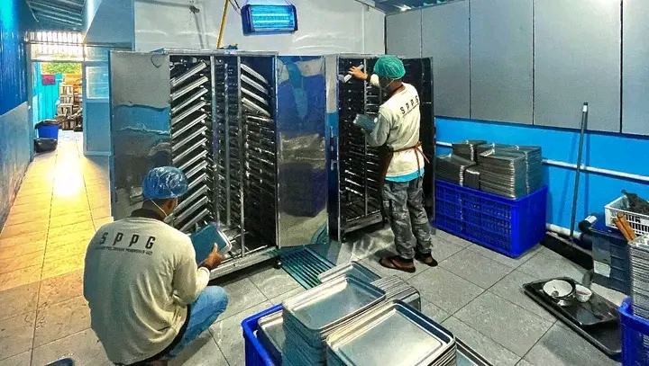 Tak sekadar mencuci bersih, dapur ini menerapkan teknologi oven pengering untuk memastikan setiap wadah makan (ompreng) benar-benar steril dan bebas dari kontaminasi bakteri sebelum didistribusikan ke para siswa.
