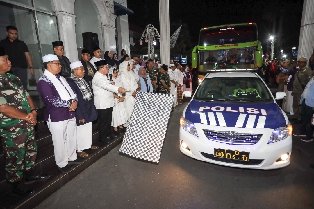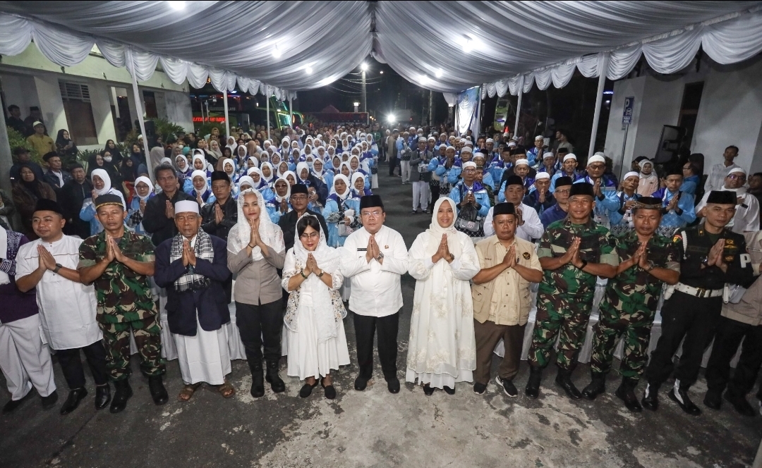 Lantunan Talbiyah mengiringi pemberangkatan 110 Jamaah Calon haji/Hajjah Pematangsiantar Tahun 1447 H/2026 M. Pemberangkatan dilepas Wali Kota Pematangsiantar Wesly Silalahi SH MKn dan Ketua TP PKK Ny Liswati Wesly Silalahi bersama Unsur Forkopimda dari halaman Balai Kota Pematangsiantar, Jalan Merdeka, Kamis (23/04/2026) sekitar pukul 03.30 WIB.