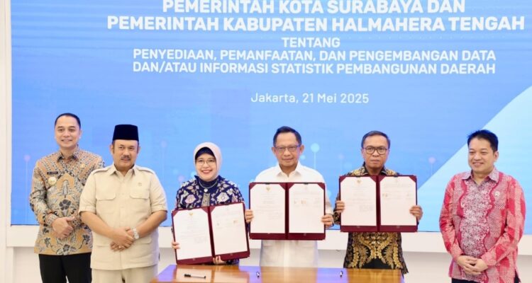 Liputanberita62.com. JAKARTA – Menteri Dalam Negeri (Mendagri) Muhammad Tito Karnavian menandatangani kerja sama dengan Badan Pusat Statistik (BPS), Pemerintah Kota Surabaya, dan Pemerintah Kabupaten Halmahera Tengah. Kerja sama tersebut mencakup